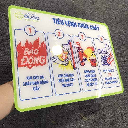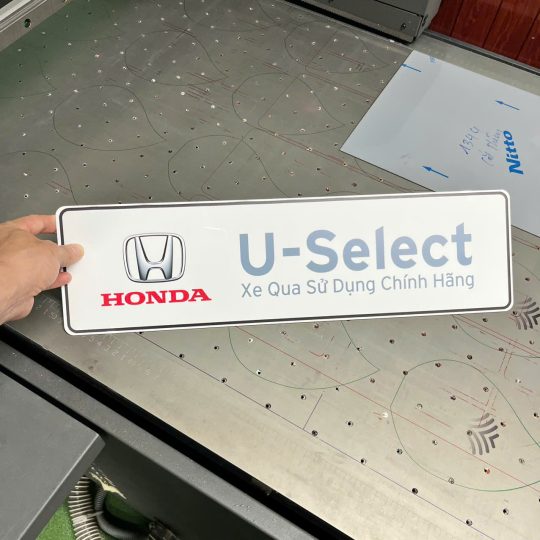 Gia công từ mica trong hoặc mica màu, kết hợp in UV, dán decal hoặc khắc laser.